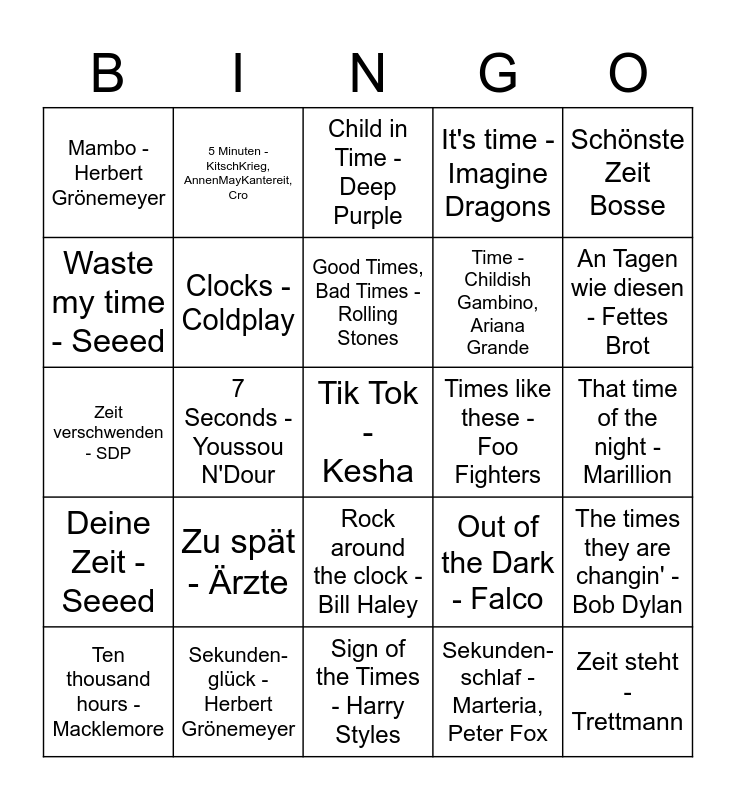 This bingo card has 30 words: Sekunden-glück - Herbert Grönemeyer, Time - Pink Floyd, 7 Seconds - Youssou N'Dour, Eine Minute - Fynn Kliemann, Mambo - Herbert Grönemeyer, Child in Time - Deep Purple, Clocks - Coldplay, Rock around the clock - Bill Haley, Times like these - Foo Fighters, Sign of the Times - Harry Styles, That time of the night - Marillion, Tik Tok - Kesha, Sekunden-schlaf - Marteria, Peter Fox, Zeit steht - Trettmann, An Tagen wie diesen - Fettes Brot, Tage wie diese - Toten Hosen, Out of the Dark - Falco, Deine Zeit - Seeed, Zu spät - Ärzte, Schönste Zeit Bosse, Zeit verschwenden - SDP, Time to wonder - Fury in the slaughterhouse, 5 Minuten - KitschKrieg, AnnenMayKantereit, Cro, Time - Childish Gambino, Ariana Grande, Waste my time - Seeed, It's time - Imagine Dragons, The times they are changin' - Bob Dylan, Ten thousand hours - Macklemore, Good Times, Bad Times - Rolling Stones and Million Years Ago - Adele.