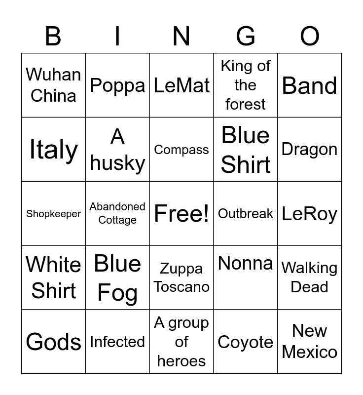 This bingo card has a free space and 24 words: Blue Fog, Infected, Compass, Gods, Band, Wuhan China, Italy, Poppa, Outbreak, Zuppa Toscano, Blue Shirt, Shopkeeper, Nonna, Walking Dead, A husky, Coyote, LeRoy, LeMat, Dragon, Abandoned Cottage, New Mexico, White Shirt, King of the forest and A group of heroes.