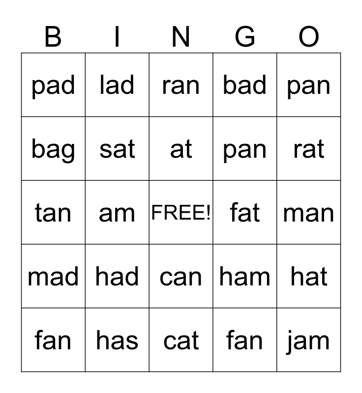 This bingo card has a free space and 24 words: had, has, at, fan, pan, pad, bag, lad, fat, can, pan, tan, ham, hat, sat, fan, man, ran, rat, am, jam, mad, bad and cat.