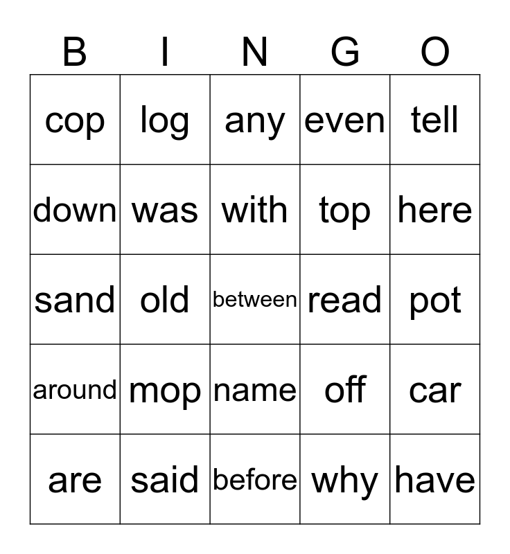 This bingo card has a free space and 24 words: mop, said, with, are, tell, cop, down, log, read, name, top, sand, off, car, was, why, pot, any, here, old, have, around, even and before.