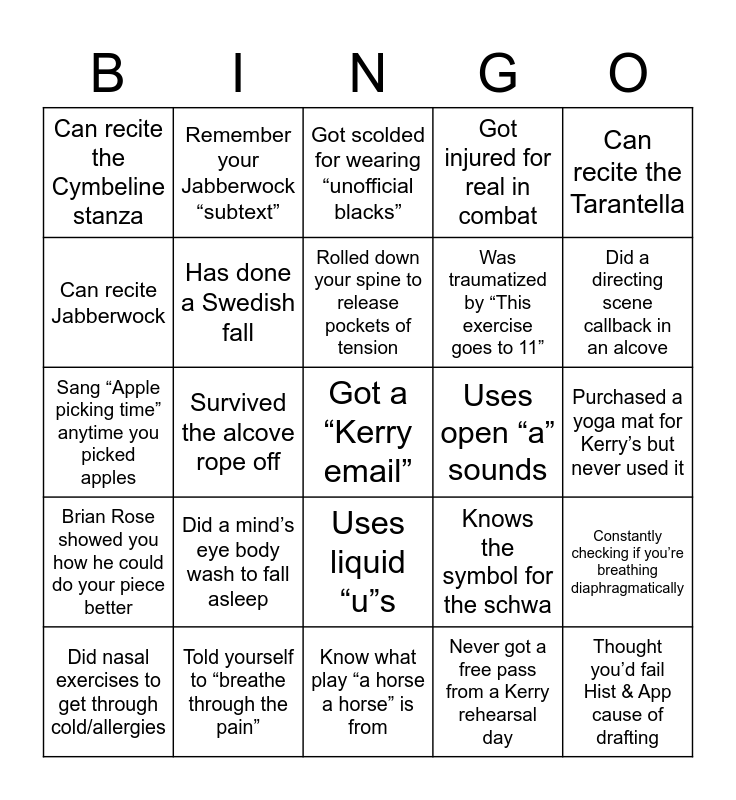 This bingo card has a free space and 24 words: Did a mind’s eye body wash to fall asleep, Told yourself to “breathe through the pain”, Rolled down your spine to release pockets of tension, Did nasal exercises to get through cold/allergies, Can recite the Tarantella, Can recite the Cymbeline stanza, Can recite Jabberwock, Remember your Jabberwock “subtext”, Uses open “a” sounds, Uses liquid “u”s, Was traumatized by “This exercise goes to 11”, Sang “Apple picking time” anytime you picked apples, Knows the symbol for the schwa, Constantly checking if you’re breathing diaphragmatically, Has done a Swedish fall, Never got a free pass from a Kerry rehearsal day, Purchased a yoga mat for Kerry’s but never used it, Got scolded for wearing “unofficial blacks”, Did a directing scene callback in an alcove, Survived the alcove rope off, Thought you’d fail Hist & App cause of drafting, Brian Rose showed you how he could do your piece better, Got injured for real in combat and Know what play “a horse a horse” is from.