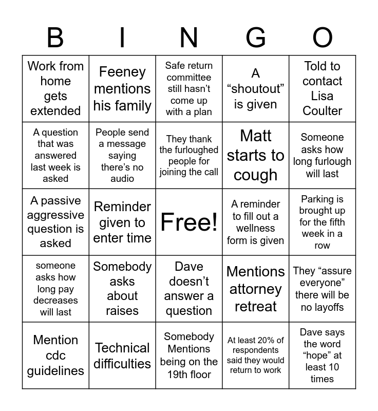 This bingo card has a free space and 24 words: Somebody asks about raises, Technical difficulties, They thank the furloughed people for joining the call, Mention cdc guidelines, Told to contact Lisa Coulter, Work from home gets extended, A question that was answered last week is asked, Feeney mentions his family, A reminder to fill out a wellness form is given, Dave doesn’t answer a question, Matt starts to cough, A passive aggressive question is asked, Mentions attorney retreat, They “assure everyone” there will be no layoffs, People send a message saying there’s no audio, At least 20% of respondents said they would return to work, Parking is brought up for the fifth week in a row, Safe return committee still hasn’t come up with a plan, Someone asks how long furlough will last, Reminder given to enter time, Dave says the word “hope” at least 10 times, someone asks how long pay decreases will last, A “shoutout” is given and Somebody Mentions being on the 19th floor.