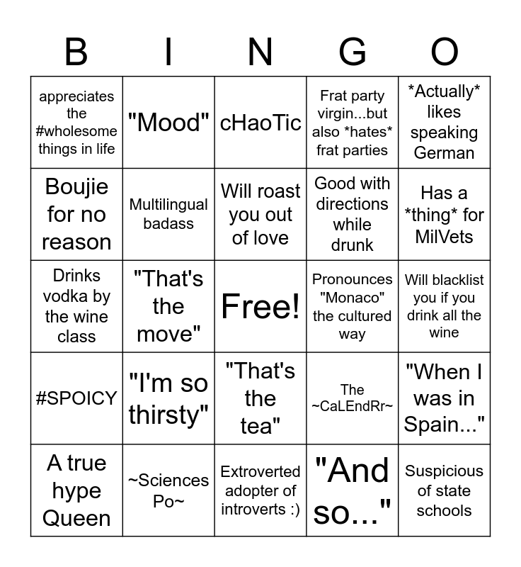 This bingo card has a free space and 24 words: "I'm so thirsty", ~Sciences Po~, Will roast you out of love, A true hype Queen, *Actually* likes speaking German, appreciates the #wholesome things in life, Boujie for no reason, "Mood", Pronounces "Monaco" the cultured way, "That's the tea", Good with directions while drunk, Drinks vodka by the wine class, The ~CaLEndRr~, "When I was in Spain...", Multilingual badass, "And so...", Will blacklist you if you drink all the wine, cHaoTic, Has a *thing* for MilVets, "That's the move", Suspicious of state schools, #SPOICY, Frat party virgin...but also *hates* frat parties and Extroverted adopter of introverts :).