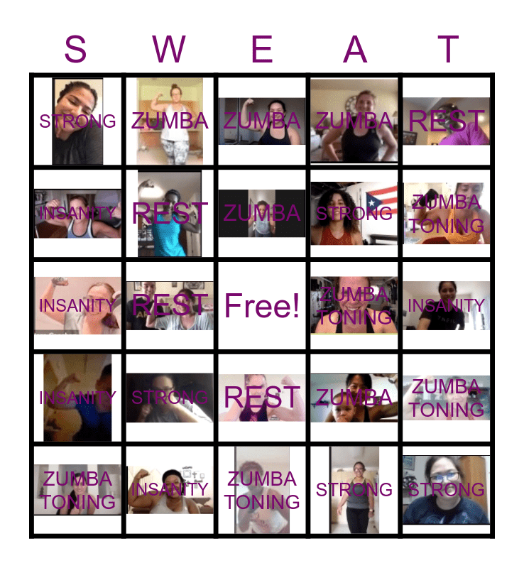 This bingo card has 24 images, a free space and 24 words: STRONG, INSANITY, ZUMBA, ZUMBA TONING, REST, STRONG, INSANITY, ZUMBA, ZUMBA TONING, REST, STRONG, INSANITY, ZUMBA, ZUMBA TONING, REST, STRONG, INSANITY, ZUMBA, ZUMBA TONING, REST, STRONG, INSANITY, ZUMBA and ZUMBA TONING.