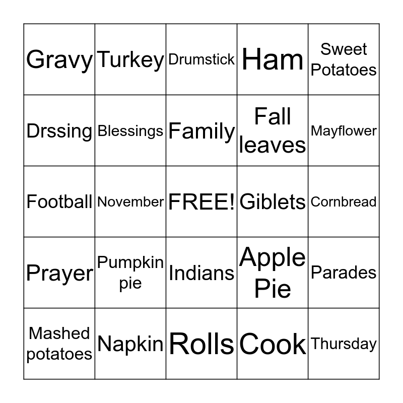 This bingo card has a free space and 24 words: Pumpkin pie, Napkin, Family, Mashed potatoes, Sweet Potatoes, Gravy, Drssing, Turkey, Giblets, Indians, Fall leaves, Football, Apple Pie, Parades, Blessings, Cook, Cornbread, Drumstick, Mayflower, November, Thursday, Prayer, Ham and Rolls.