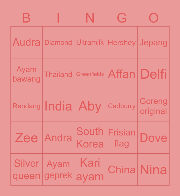 This bingo card has 25 words: Andra, Kari ayam, Greenfields, Silver queen, Jepang, Audra, Ayam bawang, Diamond, Cadburry, South Korea, Affan, Rendang, Frisian flag, Dove, Thailand, Nina, Goreng original, Ultramilk, Delfi, India, Aby, Ayam geprek, Zee, Hershey and China.