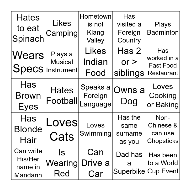 This bingo card has a free space and 24 words: Loves Cats, Is Wearing Red, Likes Indian Food, Can write His/Her name in Mandarin, Plays Badminton, Hates to eat Spinach, Wears Specs, Likes Camping, Owns a Dog, Loves Swimming, Has 2 or > siblings, Has Brown Eyes, Has the same surname as you, Non-Chinese & can use Chopsticks, Plays a Musical Instrument, Dad has a Superbike, Loves Cooking or Baking, Hometown is not Klang Valley, Has worked in a Fast Food Restaurant, Hates Football, Has been to a World Cup Event, Has Blonde Hair, Has visited a Foreign Country and Can Drive a Car.