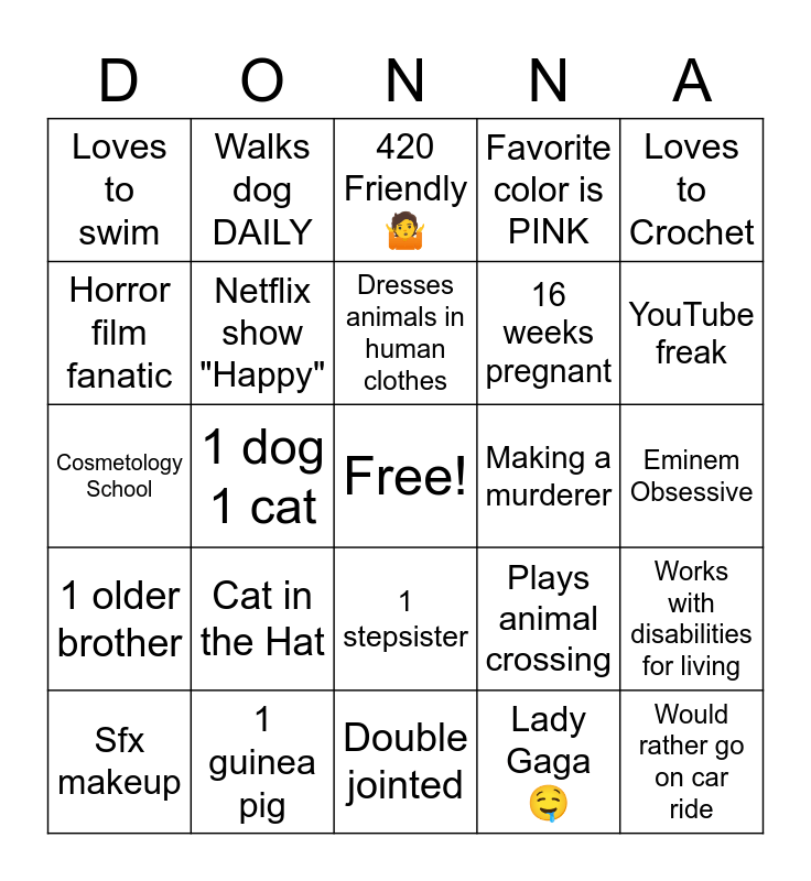 This bingo card has a free space and 24 words: Cat in the Hat, 1 guinea pig, Dresses animals in human clothes, Sfx makeup, Loves to Crochet, Loves to swim, Horror film fanatic, Walks dog DAILY, Making a murderer, 1 stepsister, 16 weeks pregnant, Cosmetology School, Plays animal crossing, Works with disabilities for living, Netflix show "Happy", Lady Gaga 🤤, Eminem Obsessive, 420 Friendly 🤷, YouTube freak, 1 dog 1 cat, Would rather go on car ride, 1 older brother, Favorite color is PINK and Double jointed.