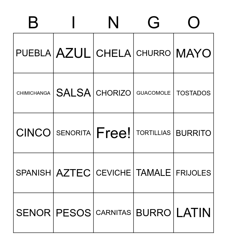 This bingo card has a free space and 35 words: NACHOS, ADOBO, GORDITA, SALSA, CEVICHE, CHURRO, CHIMICHANGA, MAIZE, CHORIZO, MEXICO, CINCO, MAYO, TACO, CHILI PEPPER, PUEBLA, TORTILLIAS, BURRO, SENORITA, SPANISH, LATIN, TAMALE, SENOR, FRIJOLES, PESOS, CHELA, TOSTADOS, ENCHILADAS, MOLE, GUACOMOLE, BURRITO, MAYA, CARNITAS, AZTEC, AZUL and AGUA.