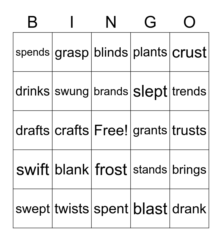 This bingo card has a free space and 24 words: blank, twists, brands, swept, crust, spends, drinks, grasp, grants, frost, slept, drafts, stands, brings, swung, blast, trusts, blinds, trends, crafts, drank, swift, plants and spent.