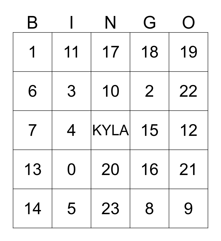 This bingo card has a free space and 24 words: 0, 5, 10, 14, 19, 1, 6, 11, 15, 20, 2, 7, 16, 21, 3, 8, 12, 17, 22, 4, 9, 13, 18 and 23.