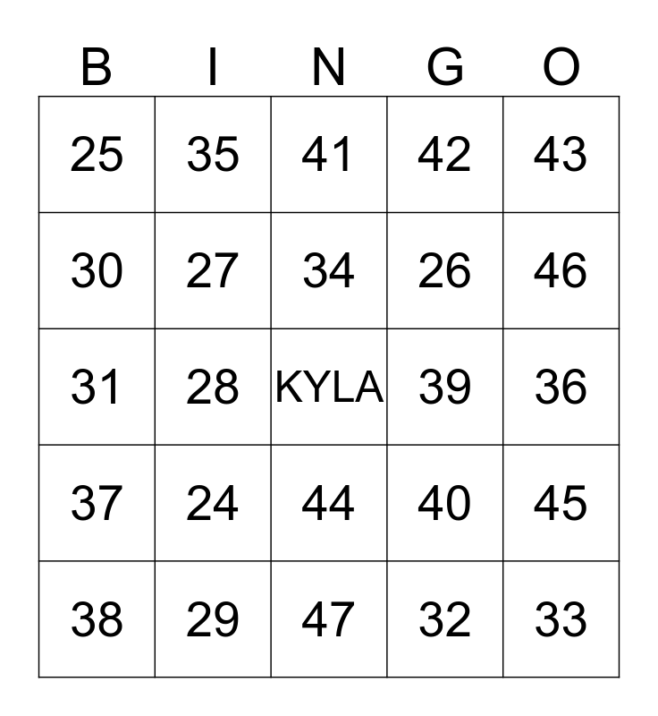 This bingo card has a free space and 24 words: 24, 29, 34, 38, 43, 25, 30, 35, 39, 44, 26, 31, 40, 45, 27, 32, 36, 41, 46, 28, 33, 37, 42 and 47.