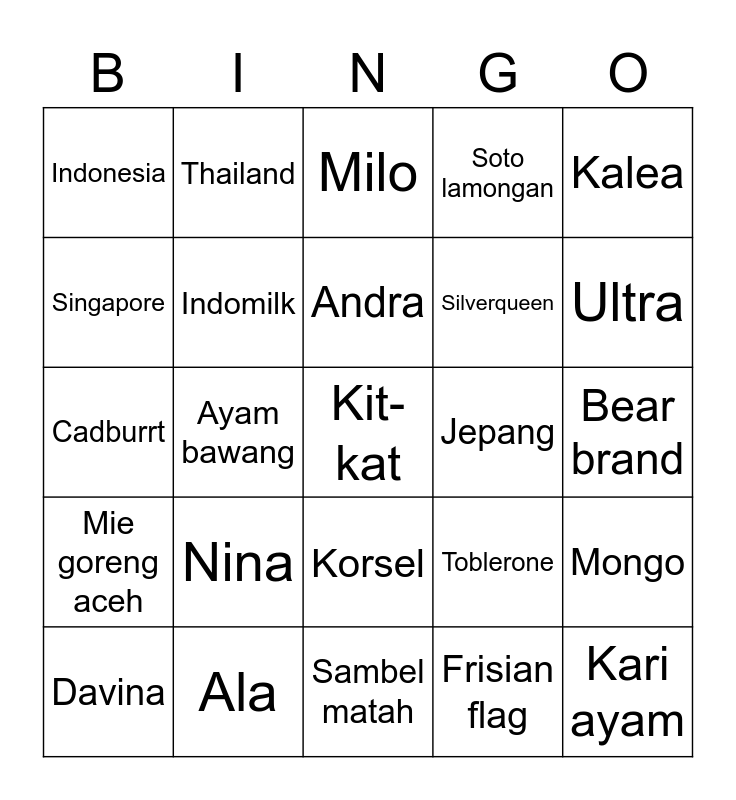 This bingo card has a free space and 24 words: Nina, Ala, Andra, Davina, Kalea, Indonesia, Singapore, Thailand, Jepang, Korsel, Silverqueen, Cadburrt, Toblerone, Mongo, Indomilk, Frisian flag, Bear brand, Milo, Ultra, Ayam bawang, Kari ayam, Mie goreng aceh, Soto lamongan and Sambel matah.