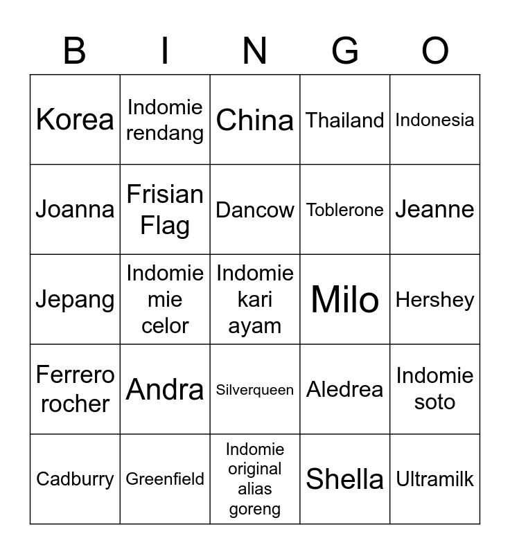 This bingo card has 25 words: Andra, Indomie original alias goreng, Dancow, Cadburry, Indonesia, Korea, Joanna, Indomie rendang, Milo, Silverqueen, Toblerone, Jepang, Aledrea, Indomie soto, Frisian Flag, Ultramilk, Hershey, China, Jeanne, Indomie mie celor, Indomie kari ayam, Greenfield, Ferrero rocher, Thailand and Shella.