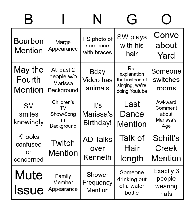 This bingo card has a free space and 24 words: Twitch Mention, Family Member Appearance, Bday Video has animals, Mute Issue, Convo about Yard, Bourbon Mention, May the Fourth Mention, Marge Appearance, Last Dance Mention, AD Talks over Kenneth, Re-explanation that instead of singing, we're doing Youtube, SM smiles knowingly, Talk of Hair length, Schitt's Creek Mention, At least 2 people w/o Marissa Background, Someone drinking out of a water bottle, Awkward Comment about Marissa's Age, HS photo of someone with braces, Someone switches rooms, Children's TV Show/Song in Background, Exactly 3 people wearing hats, K looks confused or concerned, SW plays with his hair and Shower Frequency Mention.
