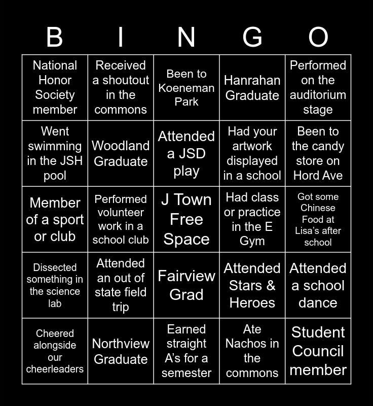 This bingo card has a free space and 24 words: Attended an out of state field trip, Northview Graduate, Attended a JSD play, Cheered alongside our cheerleaders, Performed on the auditorium stage, National Honor Society member, Went swimming in the JSH pool, Received a shoutout in the commons, Had class or practice in the E Gym, Fairview Grad, Had your artwork displayed in a school, Member of a sport or club, Attended Stars & Heroes, Attended a school dance, Woodland Graduate, Ate Nachos in the commons, Got some Chinese Food at Lisa’s after school, Been to Koeneman Park, Been to the candy store on Hord Ave, Performed volunteer work in a school club, Student Council member, Dissected something in the science lab, Hanrahan Graduate and Earned straight A’s for a semester.