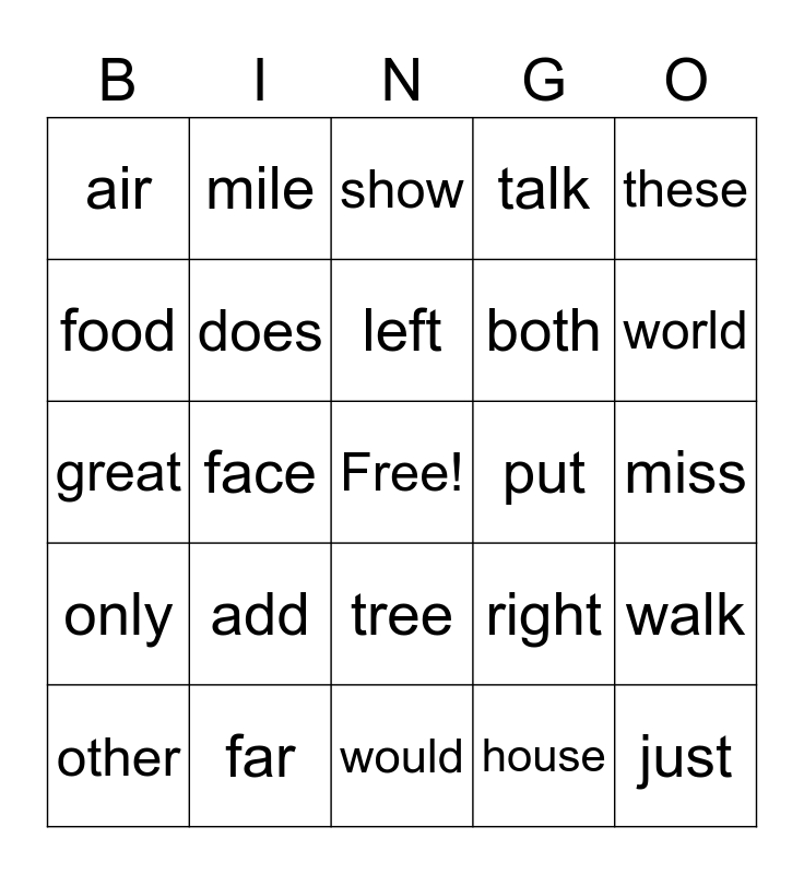 This bingo card has a free space and 24 words: add, far, left, other, these, air, food, mile, put, tree, both, great, right, walk, does, house, miss, show, world, face, just, only, talk and would.