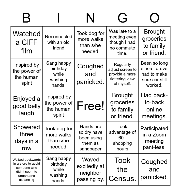 This bingo card has a free space and 72 words: Ordered liquor through the mail, Reconnected with an old friend, Inspired by the power of the human spirit, Had a day when I woke up and realized this all was starting to feel normal., Hands are so dry have been using them as sandpaper, Embracing hair in its most natural form., Was late to a meeting even though I had no commute time., Want to touch my face all the time, Regularly adjust screen to provide a more flattering view of myself., Showered three days in a row, Walked backwards in a store to avoid someone who didn’t seem to understand distancing, Had consecutive days where I walked fewer than 500 steps, Been so long since I drove had to make sure car still worked., Watched a CIFF film, Consider myself partially responsible for Ohio’s 50% increase in liquor sales, Enjoyed a good belly laugh, Took advantage of 60+ shopping hours, Brought groceries to family or friend., Able to keep track of what day it is., Had back-to-back online meetings., Took dog for more walks than s/he needed., Coughed and panicked., Participated in a Zoom meeting pant-less., Played drinking games with your kids or parents., Dressed professionally at least one day., Went into an office., Wore pants with a zipper., Waved excitedly at neighbor passing by., Cut your own hair., Sanitized mail., Sang happy birthday while washing hands., Wined with DeWine – Snacked with Acton, Braved the grocery store., Scolded someone for lack of social distancing., Took the Census., Contemplated how much toilet paper I person really should need., Ordered liquor through the mail, Reconnected with an old friend, Inspired by the power of the human spirit, Had a day when I woke up and realized this all was starting to feel normal., Hands are so dry have been using them as sandpaper, Embracing hair in its most natural form., Was late to a meeting even though I had no commute time., Want to touch my face all the time, Regularly adjust screen to provide a more flattering view of myself., Showered three days in a row, Walked backwards in a store to avoid someone who didn’t seem to understand distancing, Had consecutive days where I walked fewer than 500 steps, Been so long since I drove had to make sure car still worked., Watched a CIFF film, Consider myself partially responsible for Ohio’s 50% increase in liquor sales, Enjoyed a good belly laugh, Took advantage of 60+ shopping hours, Brought groceries to family or friend., Able to keep track of what day it is., Had back-to-back online meetings., Took dog for more walks than s/he needed., Coughed and panicked., Participated in a Zoom meeting pant-less., Played drinking games with kids or parents., Dressed professionally at least one day., Went into an office., Wore pants with a zipper., Waved excitedly at neighbor passing by., Cut my own hair., Sanitized mail., Sang happy birthday while washing hands., Wined with DeWine – Snacked with Acton, Braved the grocery store., Scolded someone for lack of social distancing., Took the Census. and Contemplated how much toilet paper I person really should need..