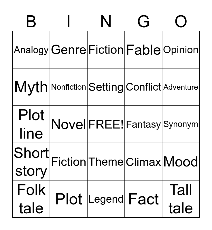 This bingo card has a free space and 24 words: Fiction, Plot, Setting, Folk tale, Opinion, Analogy, Myth, Genre, Fantasy, Theme, Conflict, Plot line, Climax, Mood, Nonfiction, Fact, Synonym, Fiction, Adventure, Novel, Tall tale, Short story, Fable and Legend.