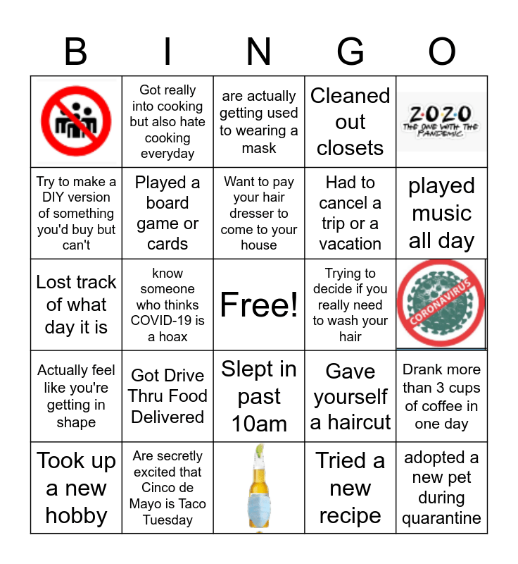 This bingo card has 4 images, a free space and 20 words: Got Drive Thru Food Delivered, Are secretly excited that Cinco de Mayo is Taco Tuesday, Want to pay your hair dresser to come to your house, Took up a new hobby, Try to make a DIY version of something you'd buy but can't, Got really into cooking but also hate cooking everyday, Trying to decide if you really need to wash your hair, Slept in past 10am, Had to cancel a trip or a vacation, Lost track of what day it is, Gave yourself a haircut, Drank more than 3 cups of coffee in one day, Played a board game or cards, Tried a new recipe, are actually getting used to wearing a mask, played music all day, know someone who thinks COVID-19 is a hoax, adopted a new pet during quarantine, Actually feel like you're getting in shape and Cleaned out closets.