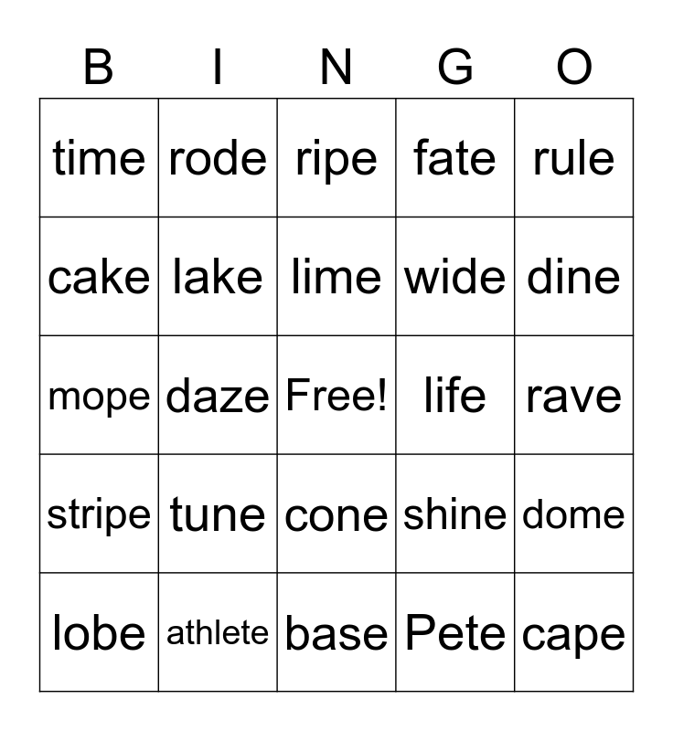 This bingo card has a free space and 44 words: wade, cape, hide, lobe, cube, Pete, ripe, note, rule, athlete, fate, life, cone, tune, cave, base, pile, mope, mute, dine, rode, stove, fine, time, choke, rave, kite, wife, shine, stripe, hope, dome, flute, prune, daze, life, rude, dine, lime, cake, wide, hike, lake and save.