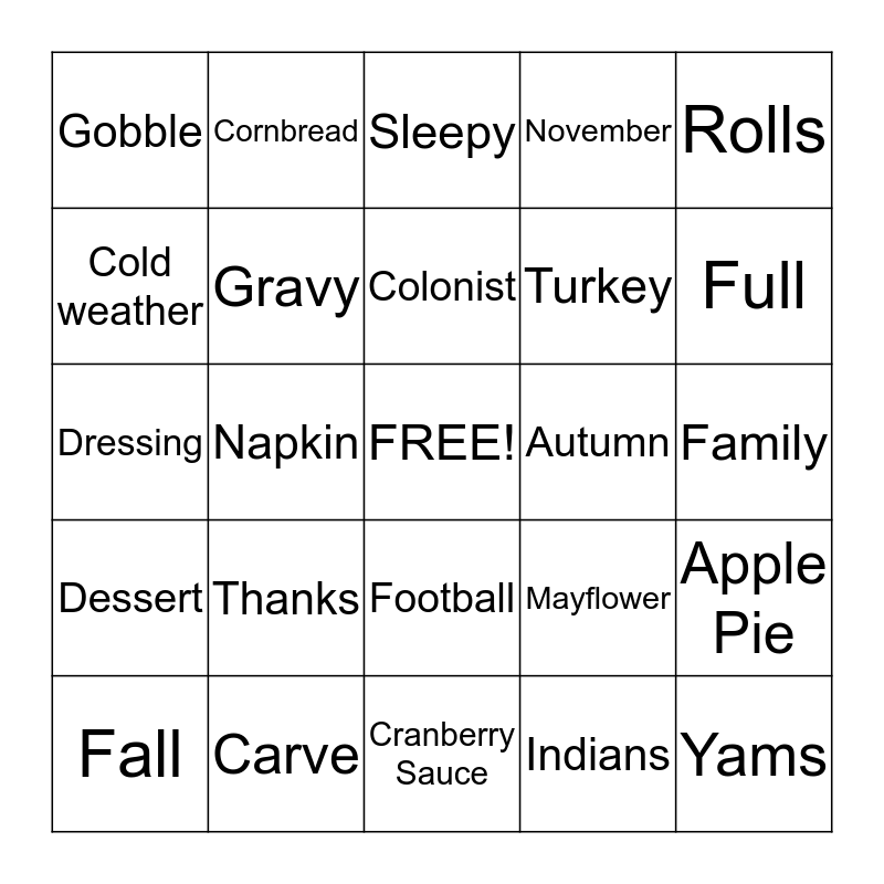 This bingo card has a free space and 24 words: Thanks, Carve, Colonist, Fall, Rolls, Gobble, Cold weather, Cornbread, Autumn, Football, Turkey, Dressing, Mayflower, Apple Pie, Gravy, Indians, Family, Sleepy, Full, Napkin, Yams, Dessert, November and Cranberry Sauce.