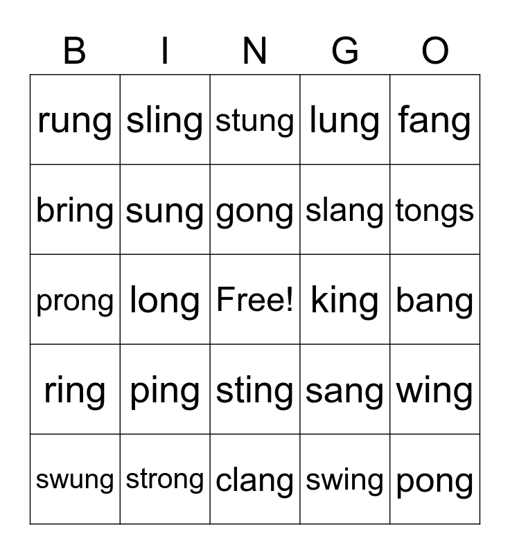 This bingo card has a free space and 36 words: rang, sing, song, sung, sang, ring, gong, hung, fang, thing, long, lung, gang, king, tongs, rung, hang, ping, pong, stung, bang, wing, strong, swung, clang, sling, prong, slung, slang, bring, flung, sprang, swing, sting, sting and spring.