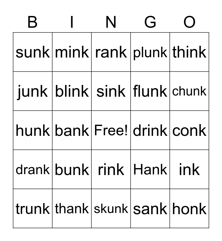 This bingo card has a free space and 42 words: tank, sink, bonk, bunk, sank, ink, honk, dunk, rank, rink, conk, chunk, bank, think, gunk, Hank, link, hunk, yank, mink, junk, shank, pink, sunk, shrank, wink, flunk, blank, shrink, shrunk, flank, drank, blink, skunk, stink, trunk, thank, drink, stunk, stank, plunk and slunk.