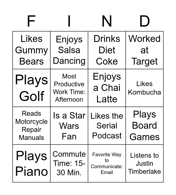 This bingo card has 16 words: Commute Time: 15-30 Min., Plays Board Games, Drinks Diet Coke, Likes Gummy Bears, Reads Motorcycle Repair Manuals, Enjoys Salsa Dancing, Likes the Serial Podcast, Favorite Way to Communicate: Email, Plays Golf, Most Productive Work Time: Afternoon, Plays Piano, Worked at Target, Is a Star Wars Fan, Likes Kombucha, Enjoys a Chai Latte and Listens to Justin Timberlake.