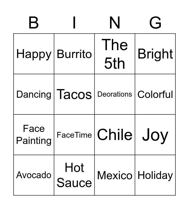 This bingo card has 40 words: Festival, Chile, Fun, Deorations, Parade, Sugar Skulls, Colorful, Artistic, Dancing, Holiday, Joy, Bright, Avocado, Mexico, Hot Sauce, Spirt, Creative, Happy, May, The 5th, 2020, Celebrate, Face Painting, Tacos, Military Victory, Tradition, Covid-19, Culture, Extravagant, Incredible, Beautiful, 1862, Social Distancing, Quarantine, FaceTime, Video Games, Chips, Guacamole, Burrito and Salsa.