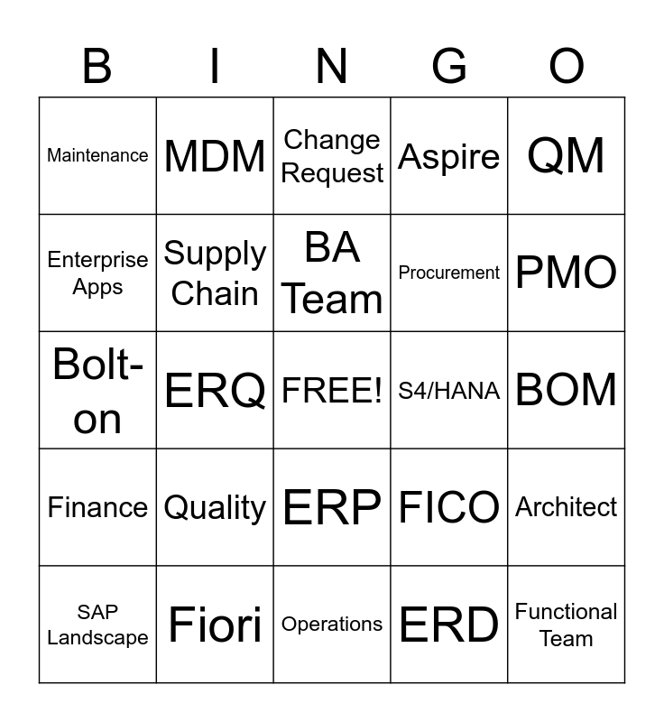 This bingo card has a free space and 24 words: Quality, Fiori, BA Team, SAP Landscape, QM, Maintenance, Enterprise Apps, MDM, S4/HANA, ERP, Procurement, Bolt-on, FICO, Architect, Supply Chain, ERD, BOM, Change Request, PMO, ERQ, Functional Team, Finance, Aspire and Operations.