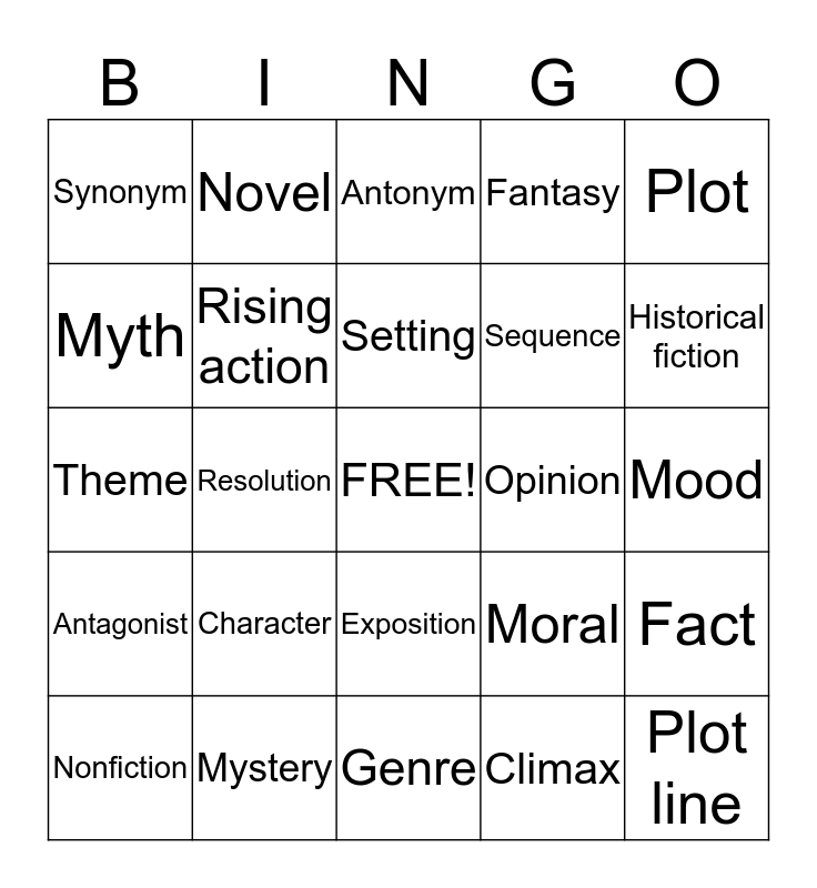 This bingo card has a free space and 24 words: Character, Mystery, Setting, Nonfiction, Plot, Synonym, Myth, Novel, Opinion, Exposition, Sequence, Theme, Moral, Fact, Rising action, Climax, Mood, Antonym, Historical fiction, Resolution, Plot line, Antagonist, Fantasy and Genre.