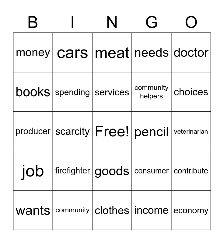 This bingo card has a free space and 24 words: firefighter, community, services, wants, doctor, money, books, cars, pencil, goods, community helpers, producer, consumer, contribute, spending, income, veterinarian, meat, choices, scarcity, economy, job, needs and clothes.