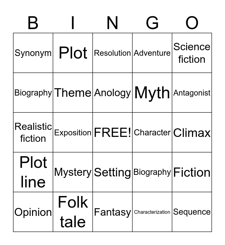 This bingo card has a free space and 24 words: Mystery, Folk tale, Anology, Opinion, Science fiction, Synonym, Biography, Plot, Character, Setting, Myth, Realistic fiction, Biography, Fiction, Theme, Characterization, Climax, Resolution, Antagonist, Exposition, Sequence, Plot line, Adventure and Fantasy.