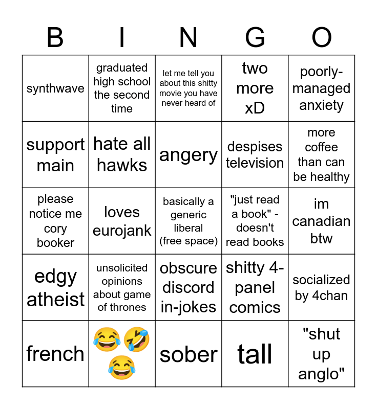 This bingo card has a free space and 24 words: french, unsolicited opinions about game of thrones, angery, tall, poorly-managed anxiety, synthwave, graduated high school the second time, let me tell you about this shitty movie you have never heard of, "just read a book" - doesn't read books, im canadian btw, please notice me cory booker, hate all hawks, shitty 4-panel comics, socialized by 4chan, support main, 😂🤣😂, sober, two more xD, more coffee than can be healthy, edgy atheist, loves eurojank, obscure discord in-jokes, despises television and "shut up anglo".