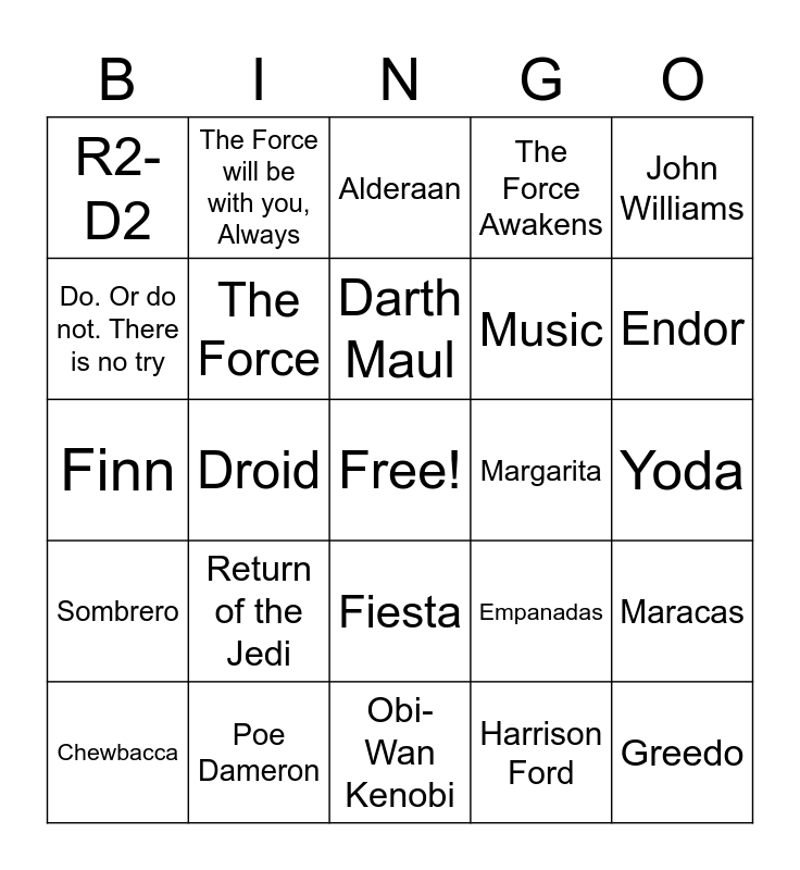 This bingo card has a free space and 74 words: New Hope, A long time ago in a galaxy far, far away, Alderaan, Anakin Skywalker, Droid, BB-8, Boba Fett, C3P0, Chewbacca, Endor, Dark Side, Darth Vader, Darth Maul, Do. Or do not. There is no try, Death star, Droid, Emperor Palpatine, Endor, Ewok, Finn, The Force, The Force will be with you, Always, The Force Awakens, George Lucas, Greedo, Han Solo, Jabba the Hutt, Jedi, Jedi Master, Jedi Mind Trick, John Williams, Kylo Ren, Lightsaber, Luke Skywalker, Mark Hamill, Harrison Ford, Carrie Fisher, The Mandalorian, Millennium Falcon, Never tell me the odds, Obi-Wan Kenobi, Poe Dameron, Pricess Leia, Return of the Jedi, Qui-Gon-Jinn, R2-D2, Rebel Alliance, Return of the Jedi, Rey, Stormtrooper, The Empire Strikes Back, Wookie, Yoda, Cinco, Mexican, Dances, Fiesta, Five, Flowers, Maracas, Music, Salsa, Sombrero, Tortilla, Margarita, Burrito, Battle of Puebla, Pinata, Empanadas, Siesta, Red, White, Green, Guacamole, Tamales and Mariachi Band.