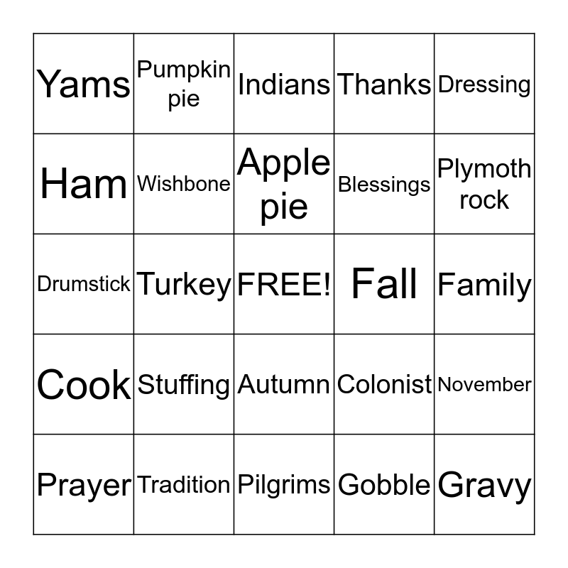 This bingo card has a free space and 24 words: Stuffing, Tradition, Apple pie, Prayer, Dressing, Yams, Ham, Pumpkin pie, Fall, Autumn, Blessings, Drumstick, Colonist, November, Wishbone, Gobble, Family, Indians, Plymoth rock, Turkey, Gravy, Cook, Thanks and Pilgrims.