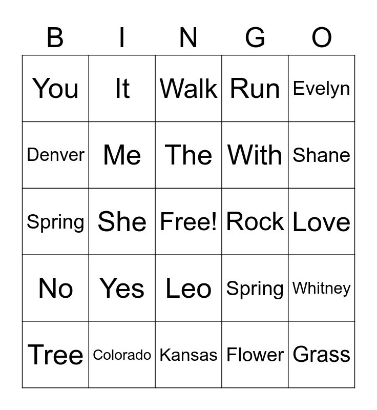 This bingo card has a free space and 24 words: Yes, Colorado, The, Tree, Evelyn, You, Denver, It, Rock, Leo, With, Spring, Spring, Whitney, Me, Flower, Love, Walk, Shane, She, Grass, No, Run and Kansas.