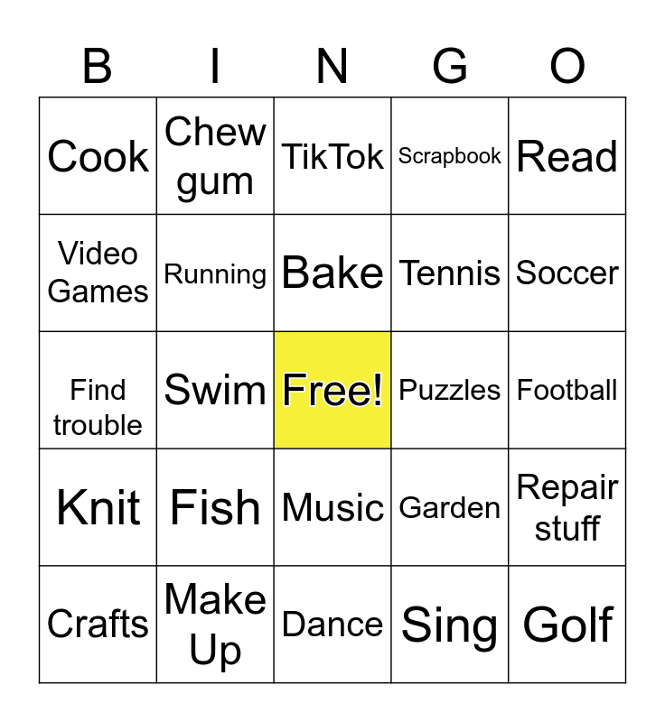 This bingo card has a free space and 39 words: Bike, Paint, Draw, Running, Crafts, Music, Bake, Movies, Read, Knit, Swim, Scrapbook, Golf, Football, Puzzles, Fish, Walking, Cook, Yoga, Garden, Video Games, Dance, Tennis, Soccer, Card Games, Pets, Creative Writing, Friends, Baseball, Chew gum, Facebook, Instagram, TikTok, Make Up, Sing, Volunteer, Repair stuff, Find trouble and Write music.