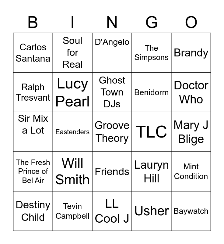 This bingo card has a free space and 24 words: Destiny Child, Will Smith, Ghost Town DJs, Usher, Brandy, Carlos Santana, Soul for Real, D'Angelo, TLC, Mary J Blige, Sir Mix a Lot, Lucy Pearl, Lauryn Hill, Mint Condition, Ralph Tresvant, Tevin Campbell, LL Cool J, The Simpsons, Doctor Who, The Fresh Prince of Bel Air, Eastenders, Friends, Benidorm and Baywatch.