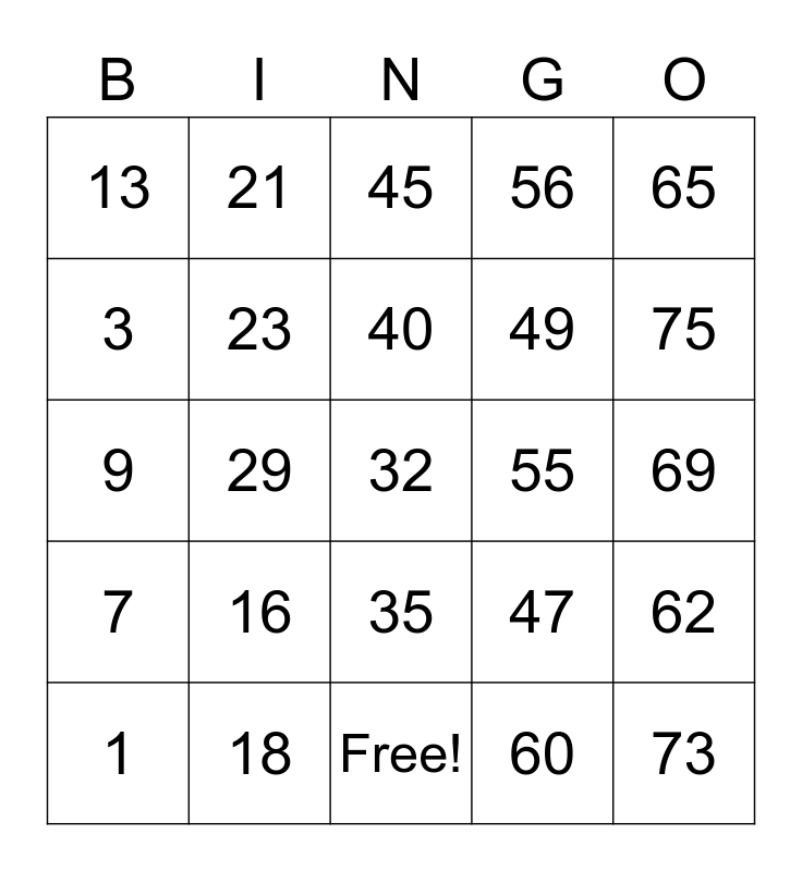 This bingo card has 25 words: 7, 18, 32, 60, 65, 13, 21, 45, 55, 62, 3, 23, Free!, 47, 75, 1, 29, 40, 49, 69, 9, 16, 35, 56 and 73.