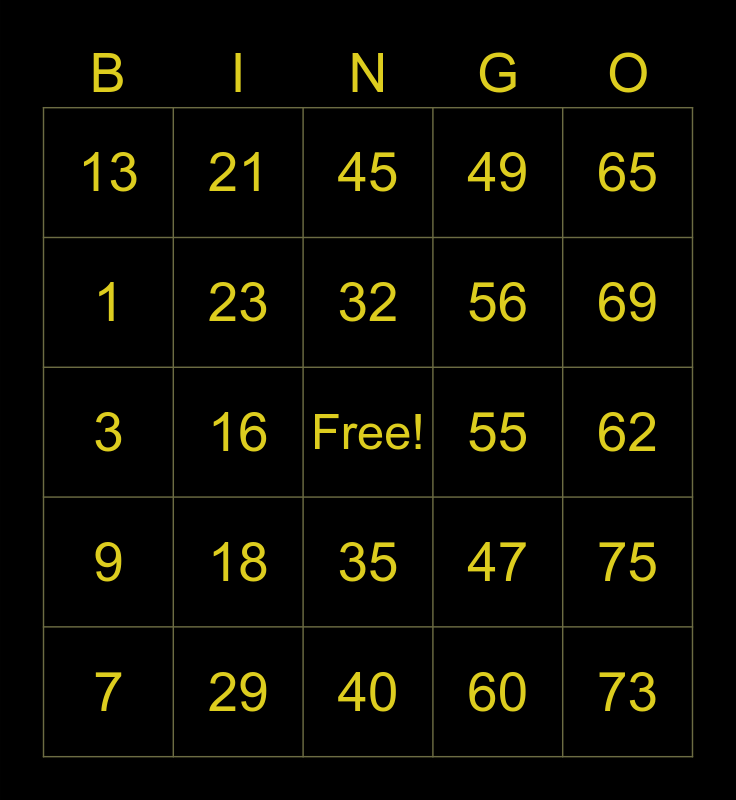 This bingo card has a free space and 24 words: 7, 18, 32, 60, 65, 13, 21, 45, 55, 62, 3, 23, 47, 75, 1, 29, 40, 49, 69, 9, 16, 35, 56 and 73.