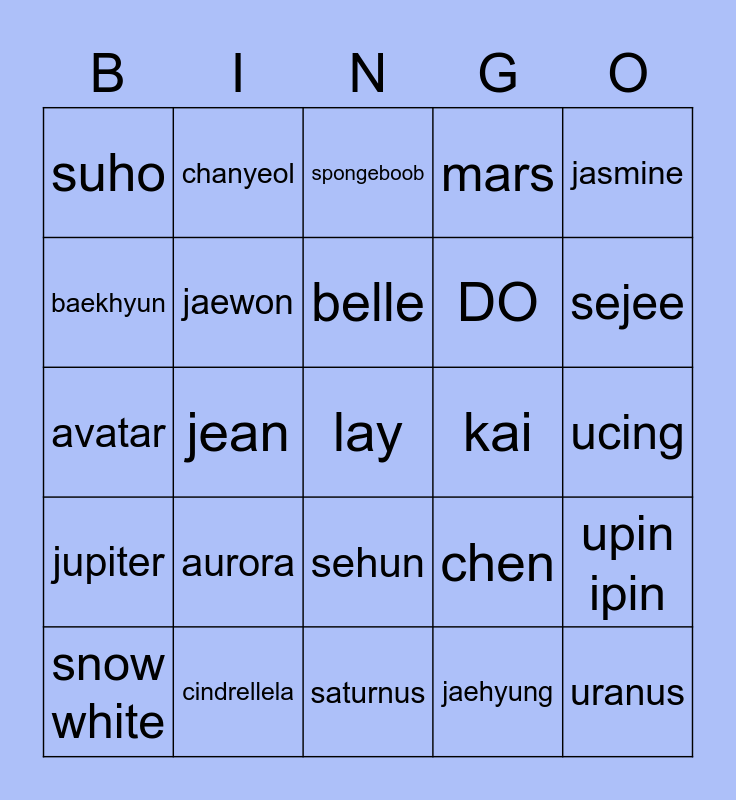 This bingo card has a free space and 24 words: aurora, cindrellela, belle, snow white, jasmine, suho, baekhyun, chanyeol, kai, sehun, DO, avatar, chen, upin ipin, jaewon, jaehyung, ucing, spongeboob, sejee, jean, uranus, jupiter, mars and saturnus.