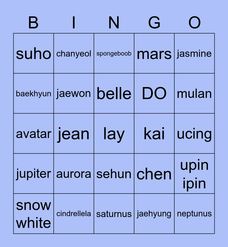 This bingo card has a free space and 24 words: aurora, cindrellela, belle, snow white, jasmine, suho, baekhyun, chanyeol, kai, sehun, DO, avatar, chen, upin ipin, jaewon, jaehyung, ucing, spongeboob, mulan, jean, neptunus, jupiter, mars and saturnus.
