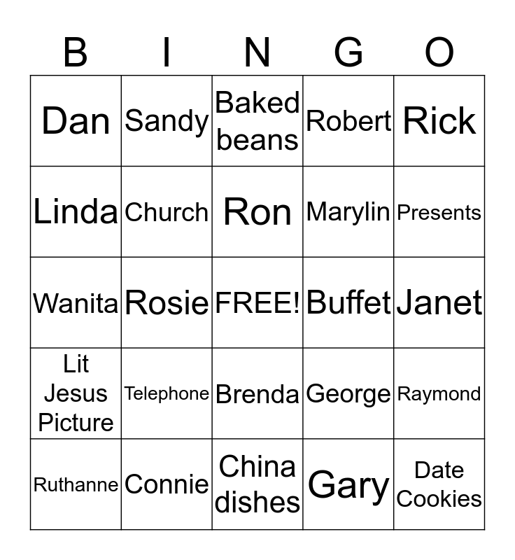 This bingo card has a free space and 26 words: Brenda, Gary, Ron, Connie, Rick, Dan, Linda, Sandy, Janet, George, Marylin, Wanita, Raymond, Ruthanne, Rosie, Richard, Robert, Lit Jesus Picture, Baked beans, Date Cookies, Presents, China dishes, Buffet, Telephone, Church and Bible.