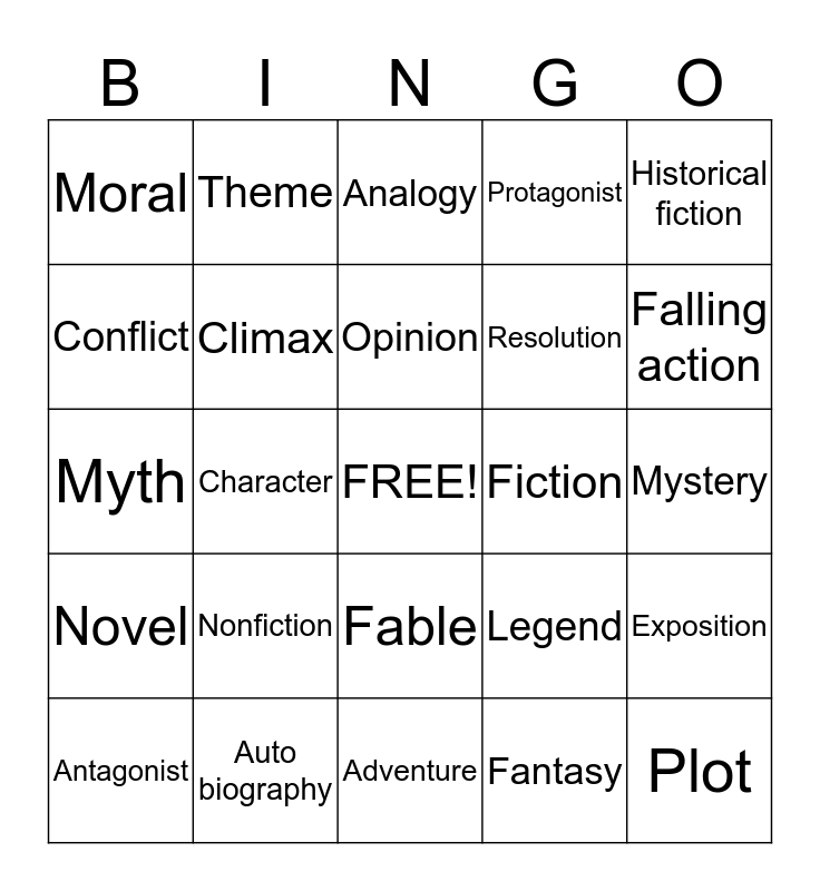 This bingo card has a free space and 24 words: Nonfiction, Auto biography, Opinion, Antagonist, Historical fiction, Moral, Conflict, Theme, Fiction, Fable, Resolution, Myth, Legend, Exposition, Climax, Fantasy, Mystery, Analogy, Falling action, Character, Plot, Novel, Protagonist and Adventure.
