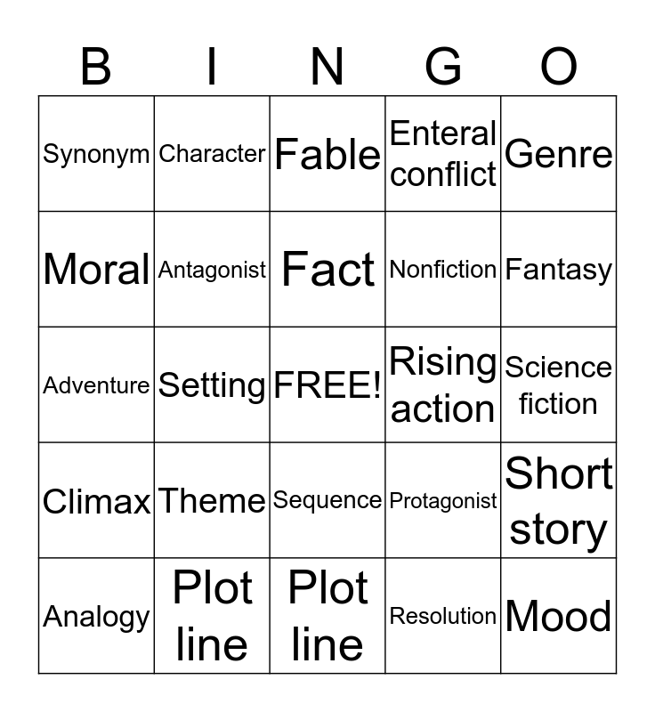 This bingo card has a free space and 24 words: Theme, Plot line, Fact, Analogy, Genre, Synonym, Moral, Character, Rising action, Sequence, Nonfiction, Adventure, Protagonist, Short story, Antagonist, Resolution, Science fiction, Fable, Fantasy, Setting, Mood, Climax, Enteral conflict and Plot line.