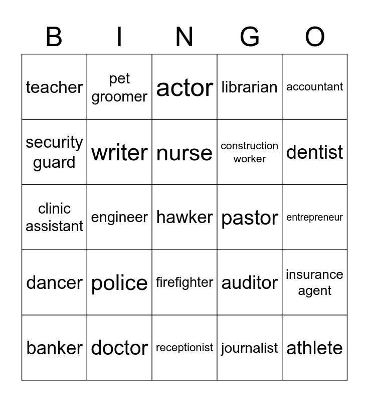 This bingo card has a free space and 24 words: police, doctor, nurse, banker, accountant, teacher, security guard, pet groomer, pastor, firefighter, construction worker, clinic assistant, auditor, insurance agent, writer, journalist, entrepreneur, actor, dentist, engineer, athlete, dancer, librarian and receptionist.