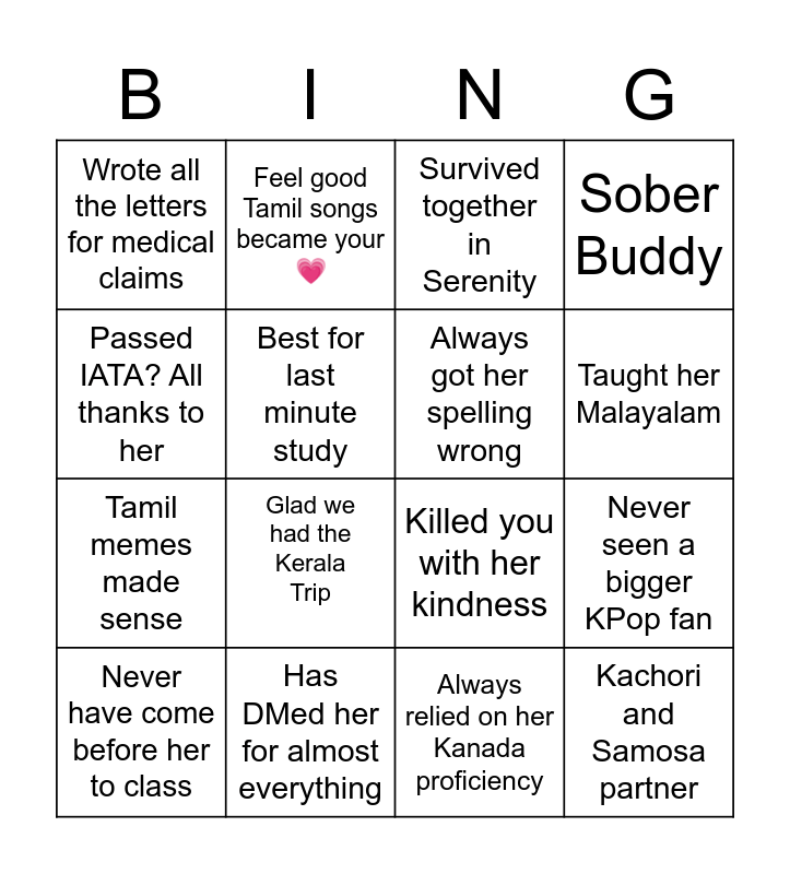 This bingo card has 25 words: Her notes are life saving, Got introduced to BTS cause of her, Taught her Malayalam, Her water bottle was your elixir, Passed IATA? All thanks to her, Wrote all the letters for medical claims, Best for last minute study, Feel good Tamil songs became your 💗, Has DMed her for almost everything, Go to Student Council, Tamil memes made sense, Killed you with her kindness, BHARGAVI BINGO, Veg food partner, Always got her spelling wrong, Being in her CIA group was a blessing, Always relied on her Kanada proficiency, Survived together in Serenity, Glad we had the Kerala Trip, Never seen a bigger KPop fan, Never have come before her to class, Always has cash, Kachori and Samosa partner, Sober Buddy and The only auxiliary do gooders ever seen.