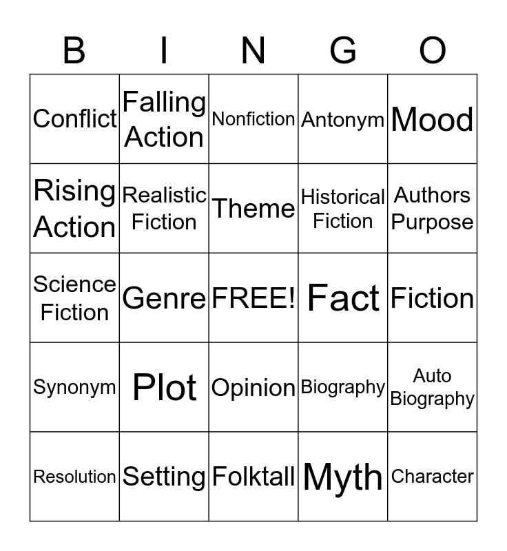 This bingo card has a free space and 24 words: Plot, Setting, Theme, Resolution, Mood, Conflict, Rising Action, Falling Action, Fact, Opinion, Historical Fiction, Science Fiction, Biography, Auto Biography, Realistic Fiction, Myth, Fiction, Nonfiction, Authors Purpose, Genre, Character, Synonym, Antonym and Folktall.